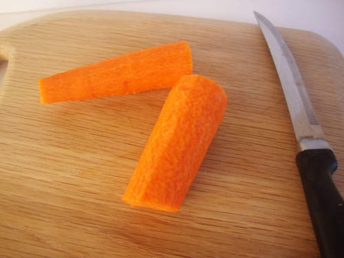 Bạn chuẩn bị một củ cà rốt tươi (loại to, nếu dùng loại nhỏ, bạn hãy chuẩn bị hai củ). Sau đó, bạn gọt vỏ, cắt thành hai khúc dày 5 cm, rồi thả vào chảo dầu, và chiên cùng thực phẩm.